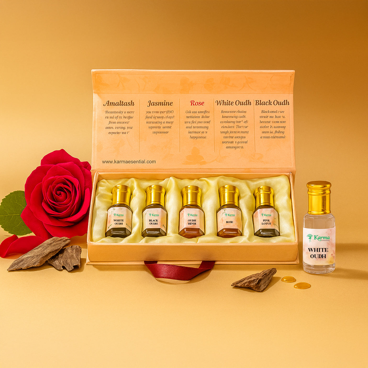 Experience the full spectrum of Karma Essential’s artistry in one luxurious set. This exclusive combo pack brings together our signature attars—Wild Rose, White Oudh, Pink Lotus, Jasmine, Black Oudh, —so you can journey through floral elegance, resinous depth, and woody mystery in a single offering.